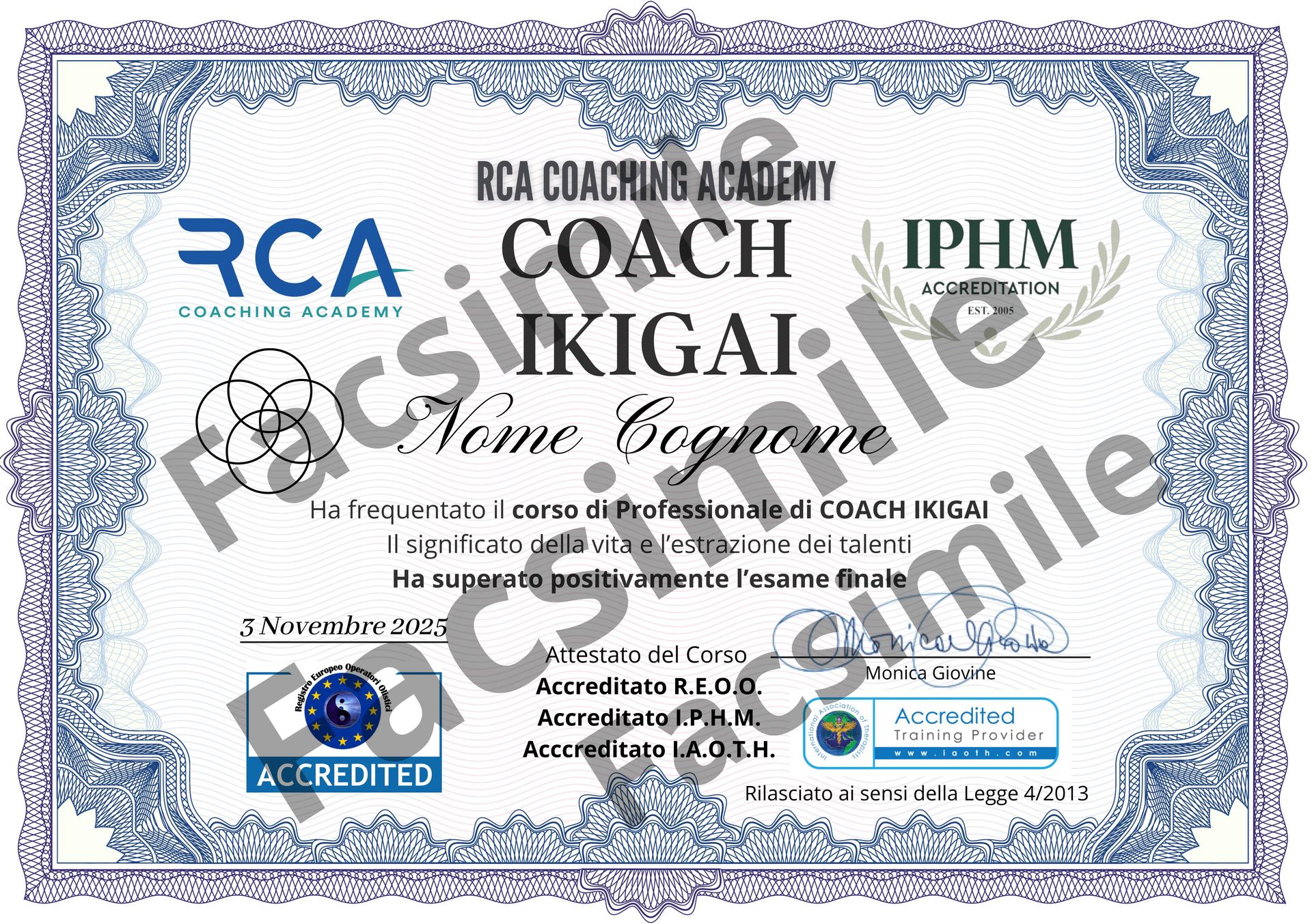 - Diploma accreditato di Coach Ikigai Professionista rilasciato dalla RCA COACHING ACADEMY